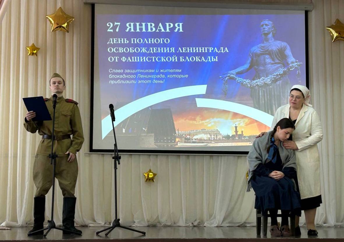 Студенты обратились к истории подвига и мужества ленинградцев, кадрам документальной хроники, послушали мелодию Седьмой «Ленинградской» симфонии Дмитрия Шостаковича.
