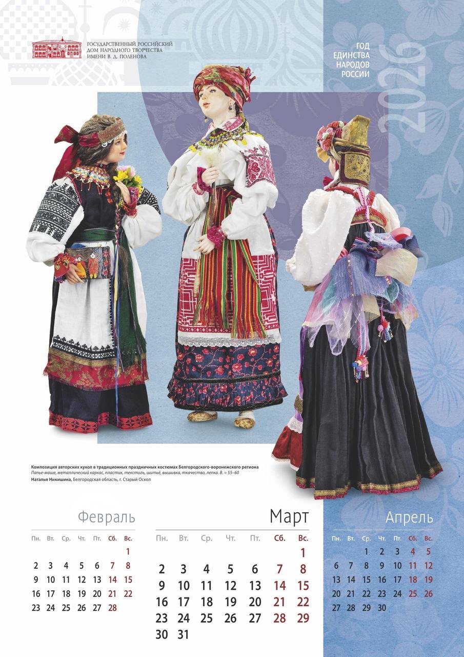 В календаре представлены работы нашей землячки, народного мастера России, директора Старооскольского Дома ремёсел – Натальи Никишиной. Её коллекция кукол в народных костюмах Белгородчины – это ювелирное соединение пластика, текстиля, ткачества, вышивки и бисероплетения.