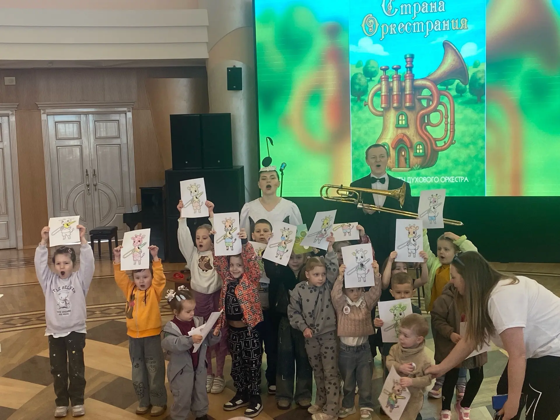 Ведущая детской музыкально-познавательной программы Нотка (Вера Цукаленко) рассказывала ребятам про тромбон. А представил этот музыкальный инструмент артист и дирижёр Концертного оркестра духовых инструментов Дмитрий Артёмов.