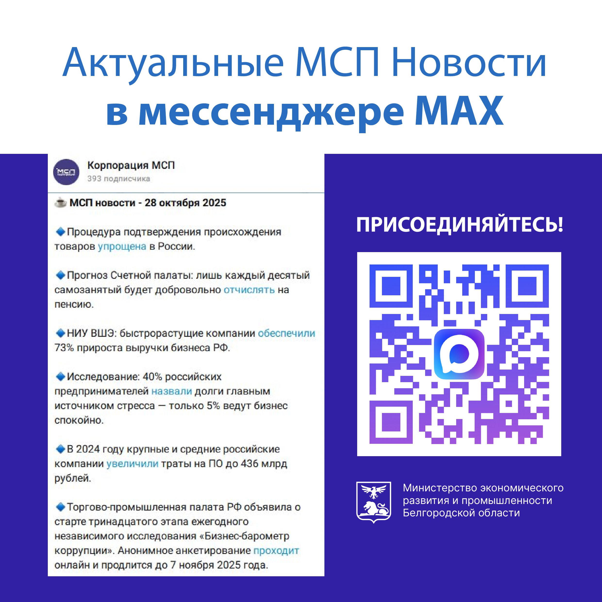 Самые актуальные и интересные новости для МСП на канале Корпорации МСП в мессенджере МАХ.