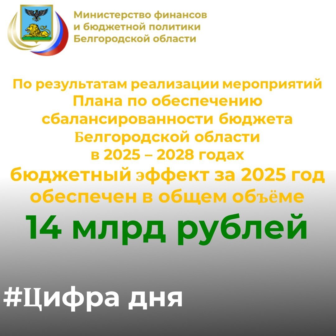 Министерство финансов Белгородской области сообщает о том, что по результатам реализации мероприятий Плана по обеспечению сбалансированности бюджета Белгородской области в 2025 – 2028 годах