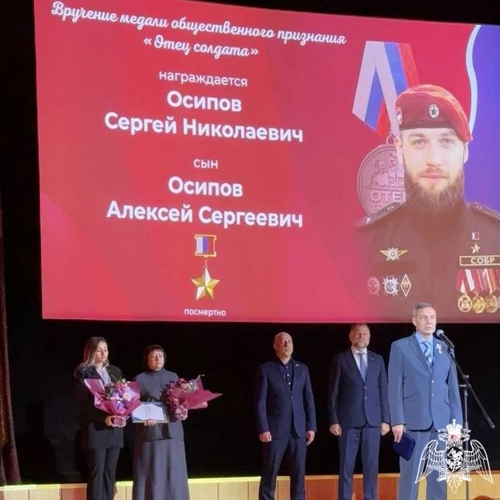Медалью «Отец солдата» награжден Осипов Сергей Николаевич - отец офицера СОБР «Белогор» Управления Росгвардии по Белгородской области майора полиции Алексея Осипова, посмертно удостоенного звания Героя России. Майор полиции Алексей Осипов героически погиб при отражении атаки на сопровождаемую колонну: уничтожив вражеский FPV-дрон, он своим телом закрыл сослуживцев от осколков взорвавшегося беспилотника.