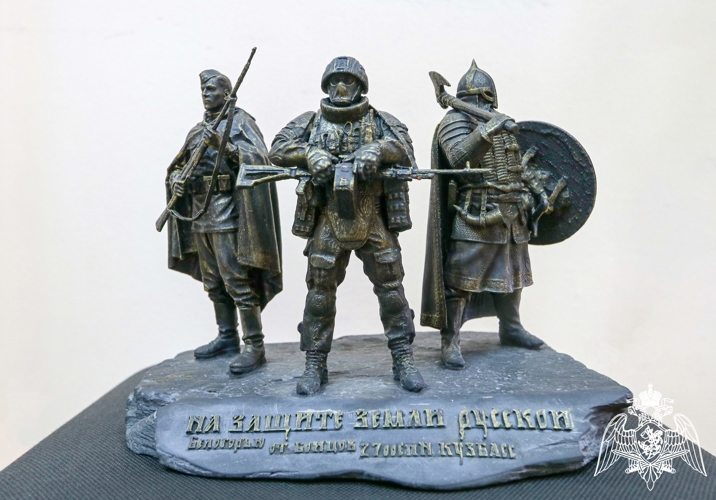 Росгвардейцы изготовили композицию своими руками. На ней запечатлены образы трех воинов, олицетворяющих доблесть русской армии в разные эпохи: воина Древней Руси, солдата Великой Отечественной войны и участника нынешней спецоперации. Этот собирательный образ подчеркивает, что долг по защите Родины неизменен во все времена. Камень, послуживший основой для скульптурной композиции, был взят с приграничной территории между городами Белгород и Харьков.