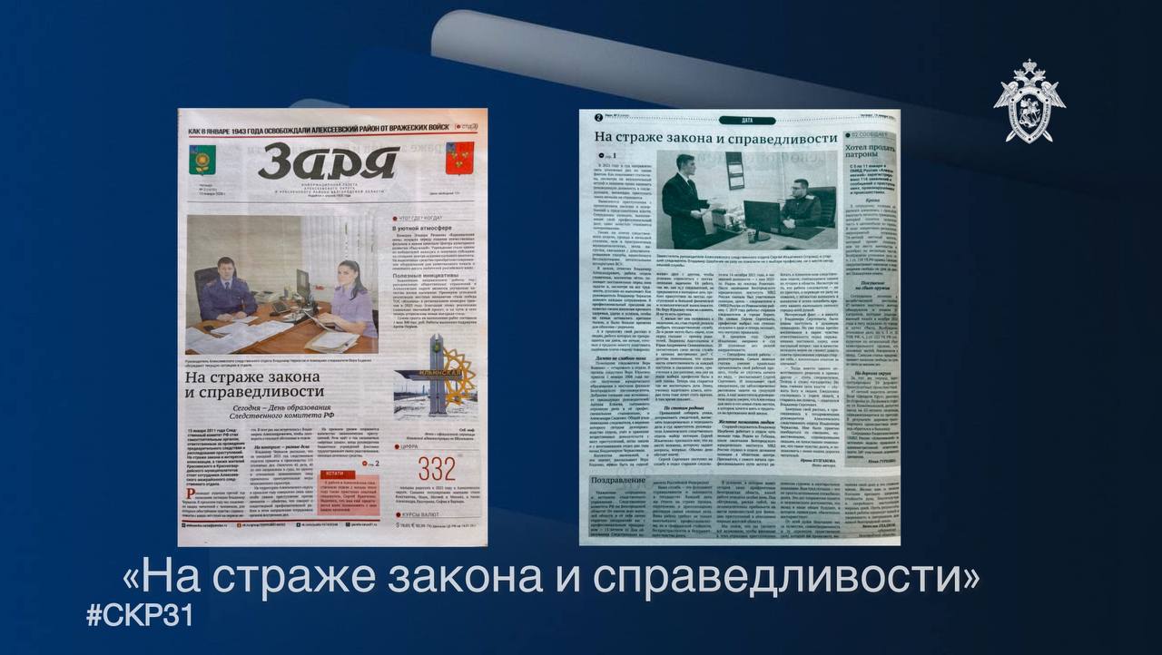 15В газете «Заря» опубликован материал об Алексеевском межрайонном следственном отделе СУ СК России по Белгородской области