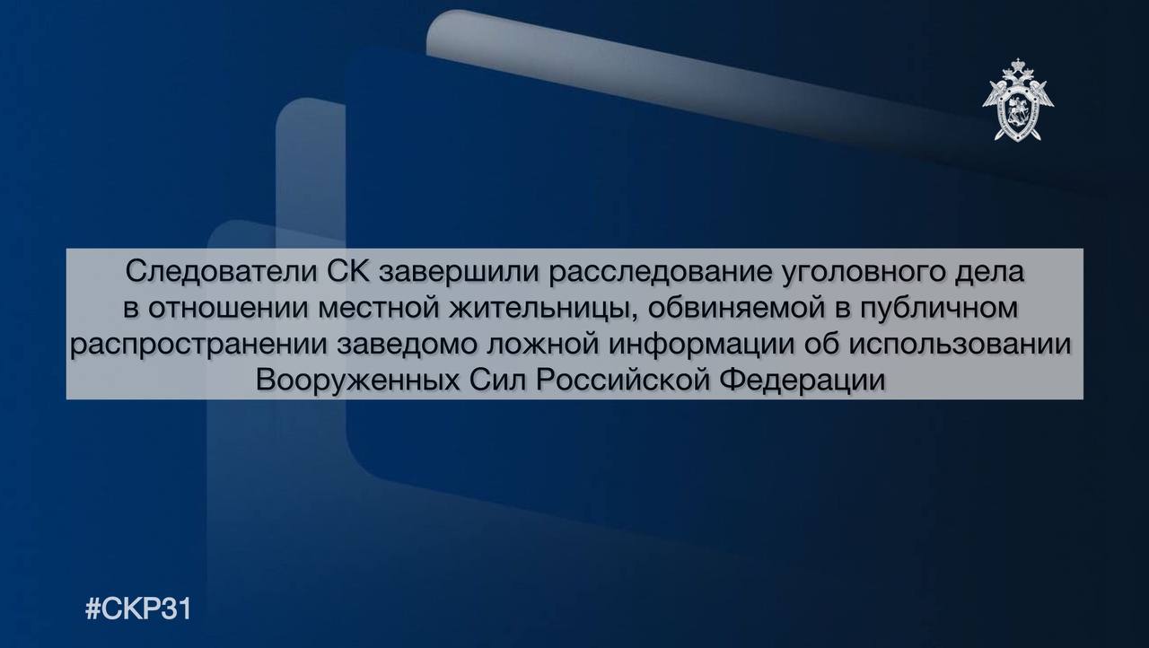 Первым отделом по расследованию особо важных дел (о преступлениях против личности и общественной безопасности) следственного управления Следственного комитета Российской Федерации по Белгородской области завершено расследование в отношении 34-летней жительницы Белгородской района, обвиняемой в совершении двух преступлений, предусмотренных п. «д» ч.2 ст. 207.3 УК РФ (публичное распространение заведомо ложной информации об использовании Вооруженных Сил Российской Федерации).