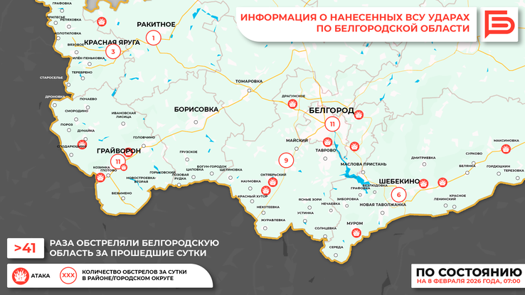 В Белгородском округе по посёлкам Дубовое, Малиновка, Разумное, Октябрьский и селу Драгунское выпущено 4 боеприпаса и совершены атаки 5 беспилотников, которые были сбиты. В результате падения обломков сбитых ракет в селе Ближняя Игуменка повреждены частный дом и автомобиль, в посёлке Разумное — 4 автомобиля и помещение на территории предприятия, в посёлке Дубовое — одна квартира в МКД, в селе Пушкарное — 2 надворные постройки и газовая труба.
