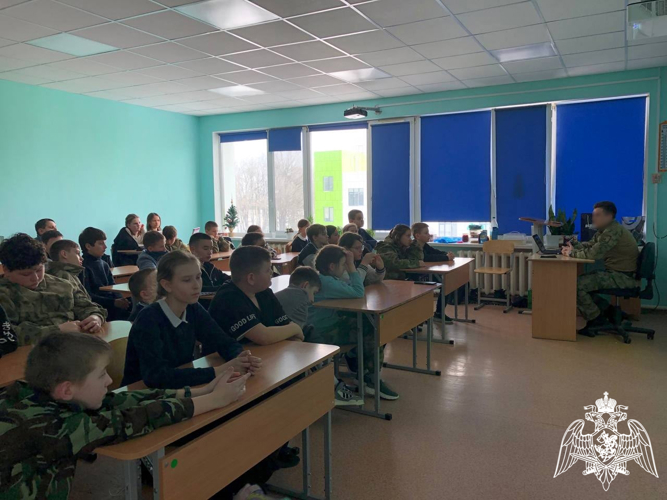 В рамках мероприятий, приуроченных к празднованию 10-летия со дня образования Федеральной службы войск национальной гвардии Российской Федерации и 215-й годовщине создания войск правопорядка в России, военнослужащий отряда специального назначения Росгвардии провел занятия с учащимися Комсомольской школы.