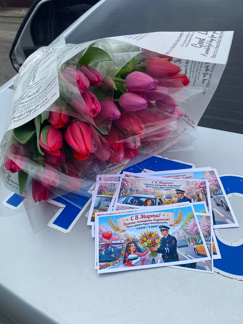 Женщины получают не только букеты, но и напоминания о ПДД от автоинспекторов.