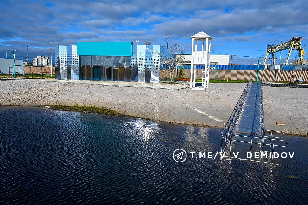 Так, например, на правом берегу центрального пляжа мы построили основание под просторный настил (170 кв.м.), который будет оборудован лежаками, навесом и специальной раздевалкой для маломобильных горожан. Проложили 35-метровый пандус из нержавеющей стали прямо к воде. Он абсолютно безопасен и соответствует всем нормативам. Рядом установим специализированную душевую кабину для максимального удобства.