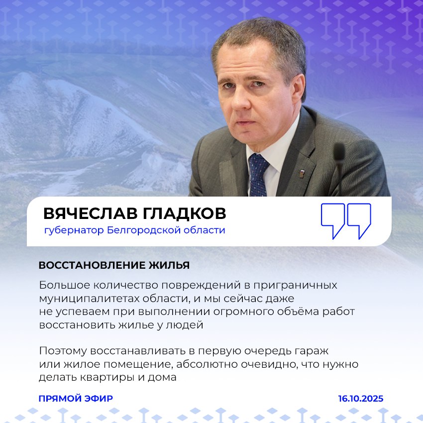 Вячеслав Гладков рассказал о порядке восстановления объектов, пострадавших от обстрелов ВСУ