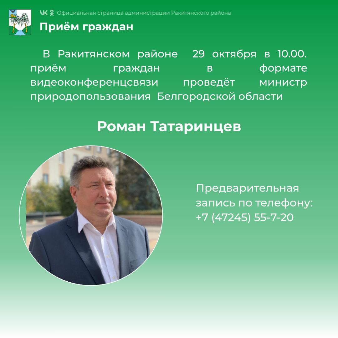 29 октября в 10:00 в администрации Ракитянского района состоится приём граждан в формате видеоконференцсвязи, который проведёт министр природопользования Белгородской области Татаринцев Роман Юрьевич.