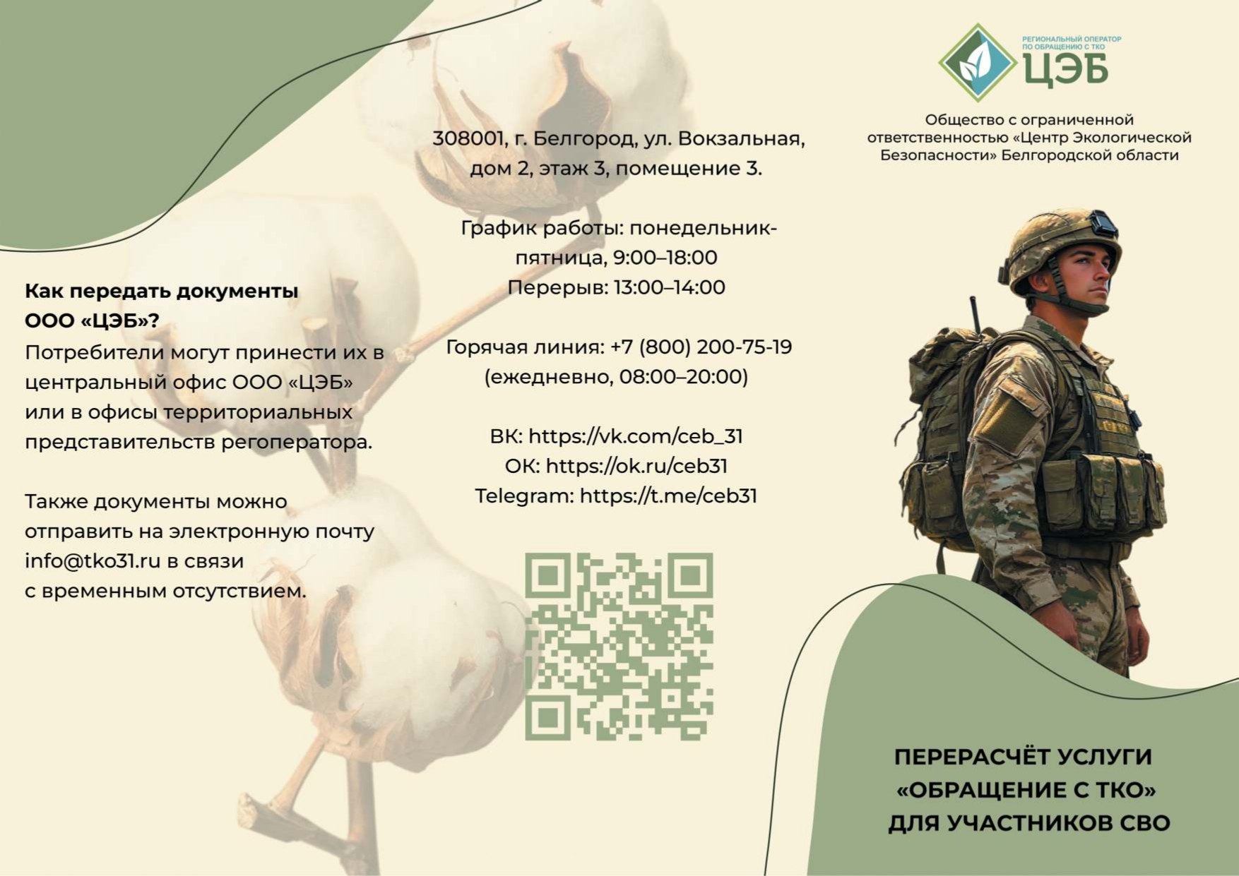 Региональный оператор ООО «Центр Экологической Безопасности» Белгородской области информирует о том, как осуществить перерасчет услуги «Обращение с ТКО» за родственника, находящегося на СВО