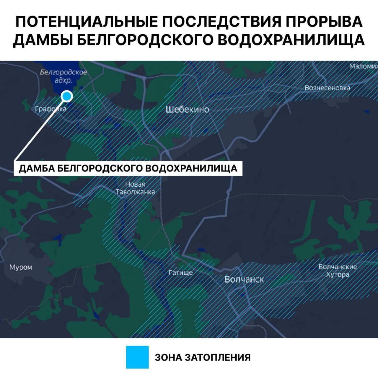 Потенциальные населенные пункты и территория, которая может быть затоплена в случае разрушения дамбы Белгородского водохранилища.
