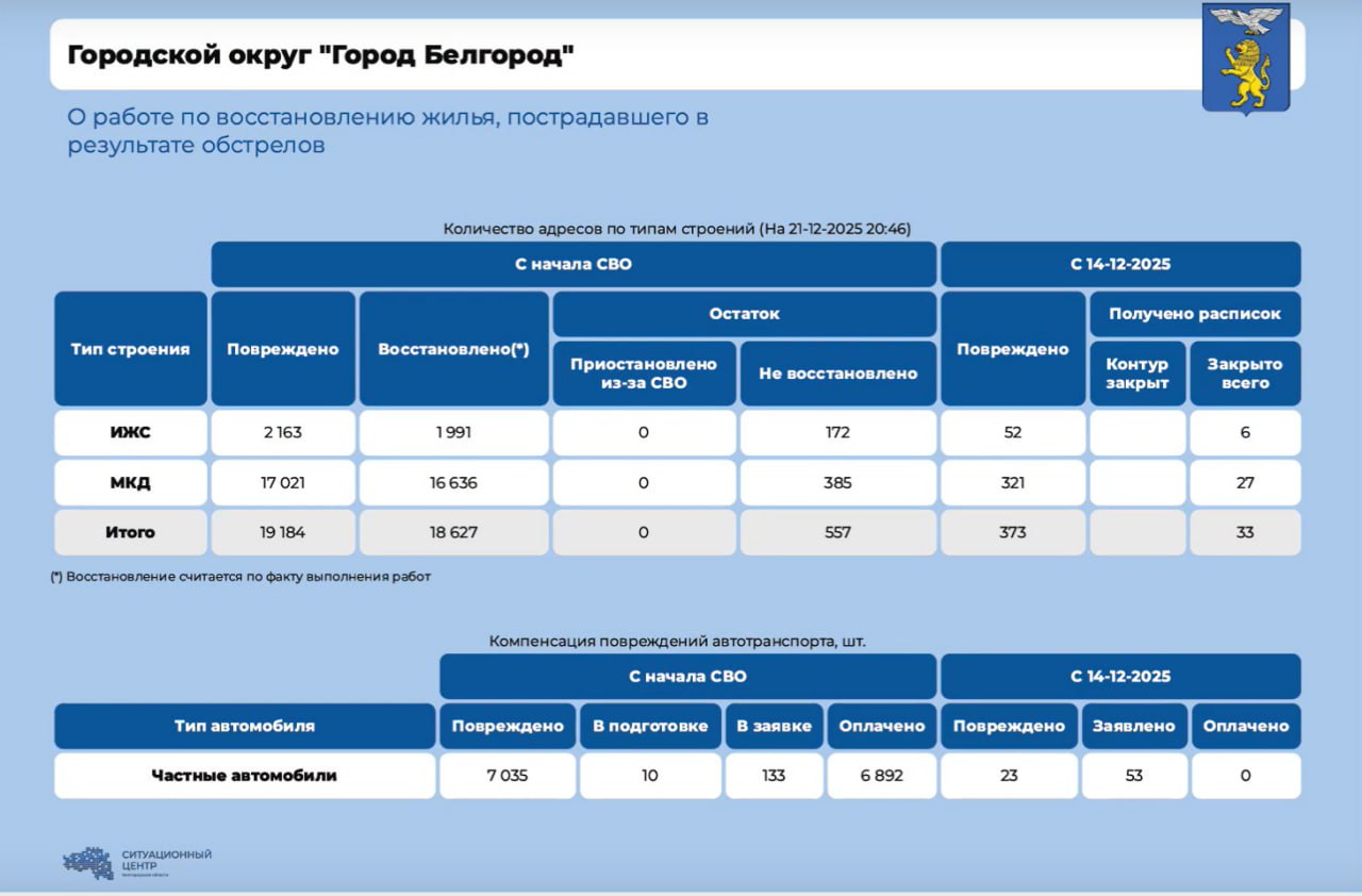За этот период в Белгороде получили повреждения 23 автомобиля. По 53 машинам уже провели экспертную оценку и передали документы на оплату. Всего в работе остаётся 10 транспортных средств. В планах завершить оценку повреждений автомобилей до 28 декабря.