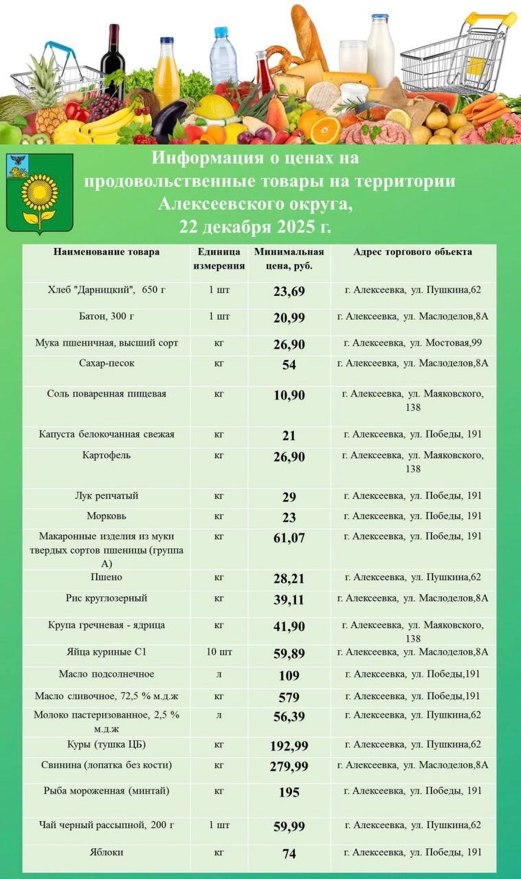 Представляем вашему вниманию обновлённый перечень минимальных цен на продовольственные товары в городе Алексеевка.