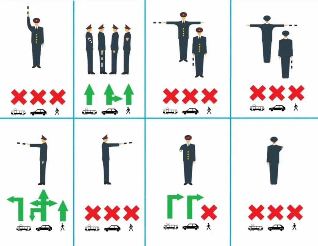 Регулировщик также помогает ориентироваться пешеходам: переходить улицу можно лишь тогда, когда руки полицейского направлены горизонтально или одна рука находится впереди тела.
