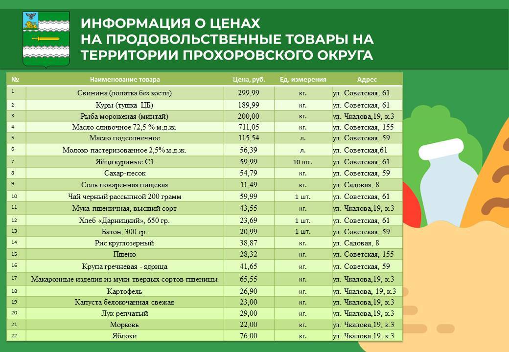Администрация округа регулярно отслеживает цены в местных магазинах, чтобы вы могли делать покупки с максимальной выгодой. В данном обзоре представлена информация о товарах повседневного спроса по самым доступным ценам на территории нашего округа.