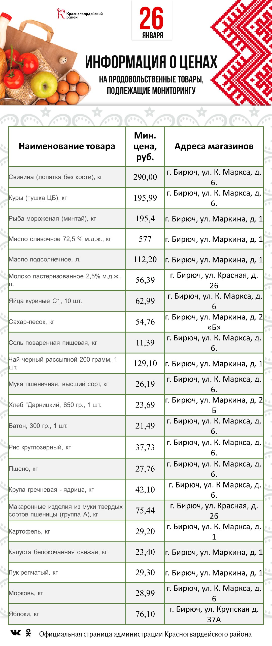 Представляем информацию о минимальных ценах набора социально значимых товаров первой необходимости по состоянию на 26 января