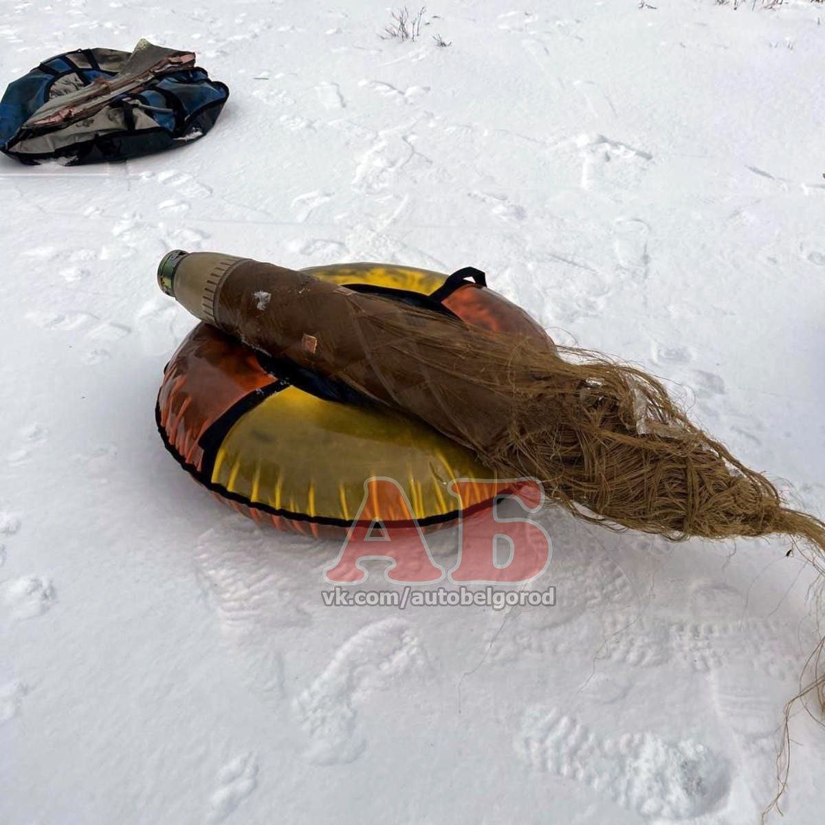 Дети катают на ватрушке отработавший стартовый двигатель ЗУР "Панциря". Белгород, февраль 2026 года.