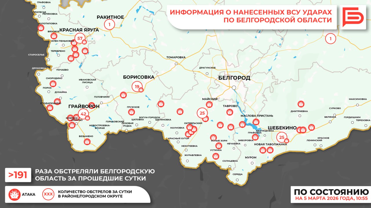 За прошедшие сутки ВСУ обстреляли Белгородскую область не менее 191 раза