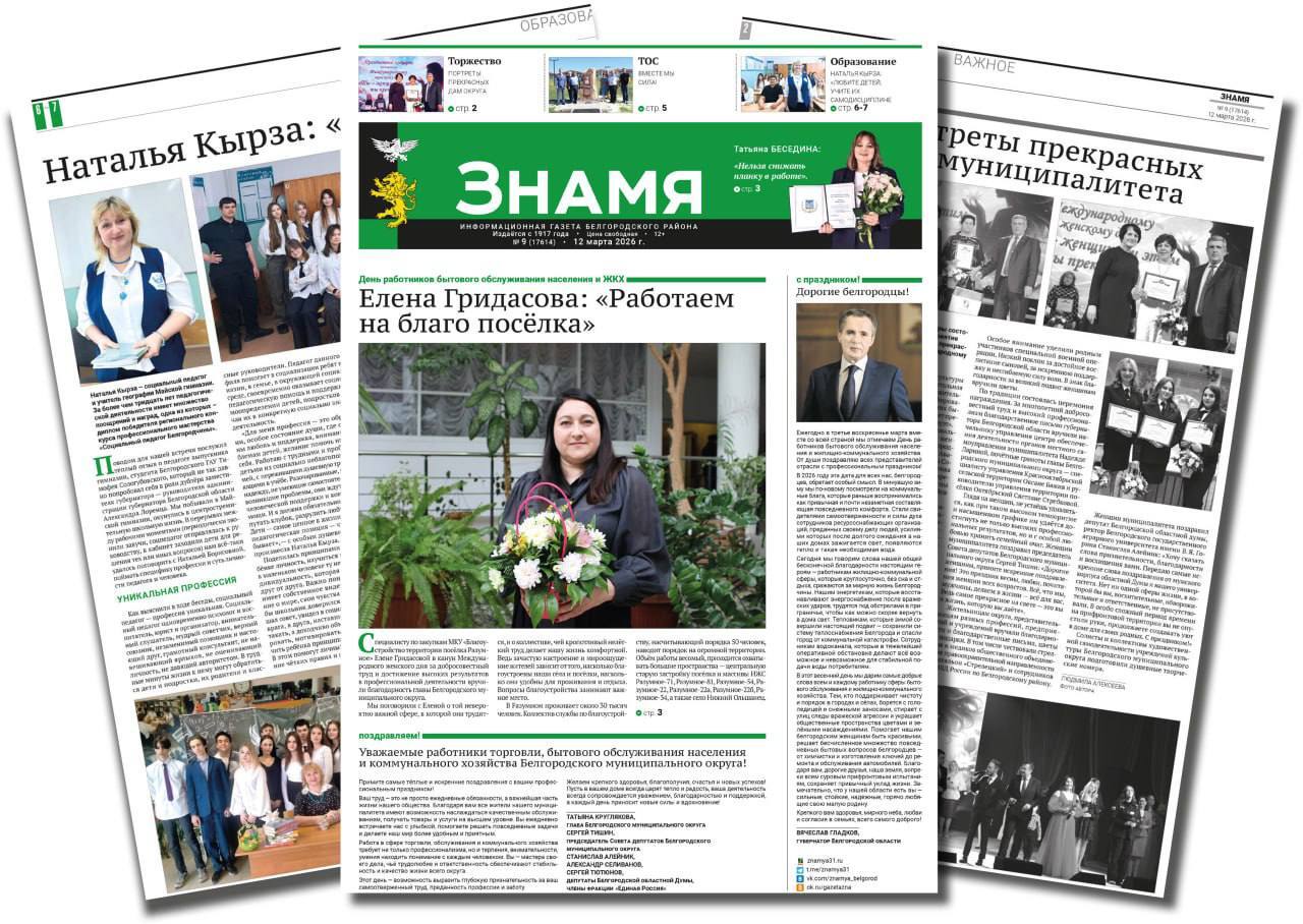 Белгородский муниципальный округ информирует читателей, что в номере газеты «Знамя» от 12 марта 2026 года публикуются важные новости округа, а также официальные объявления и проекты
