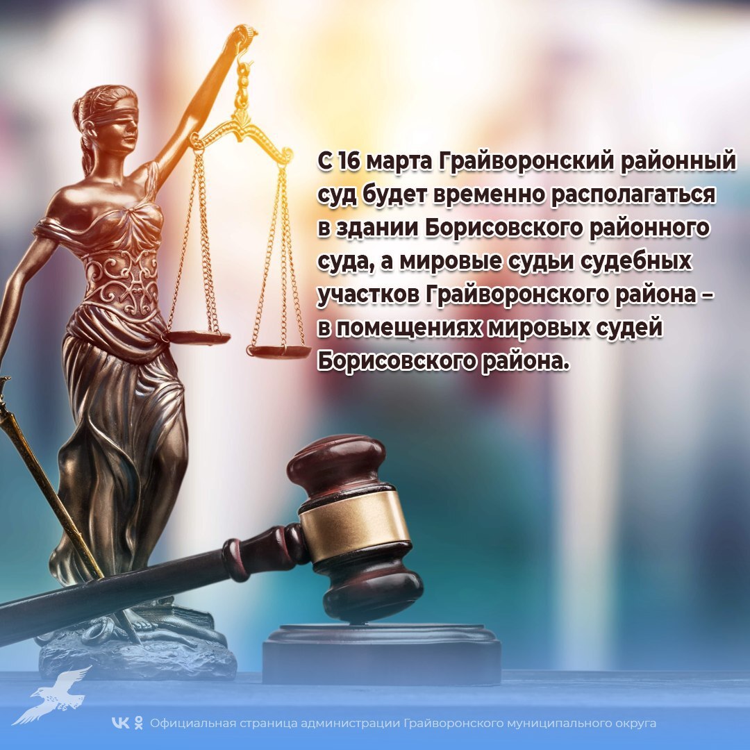 Грайворонский районный суд (https://clck.ru/3SaD56) будет временно располагаться в здании Борисовского районного суда, а мировые судьи судебных участков Грайворонского района – в помещениях мировых судей Борисовского района.