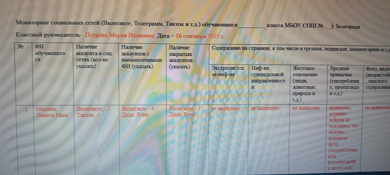 Судя по скрину таблицы, преподаватели должны анализировать посты учеников, их фото, видео и комменты. Отдельно необходимо отмечать «экстремистскую информацию», «информацию суицидальной направленности», факты жестокого обращения с людьми, животными и природой, наличие вредных привычек, а также «фото и видео непристойного содержания».