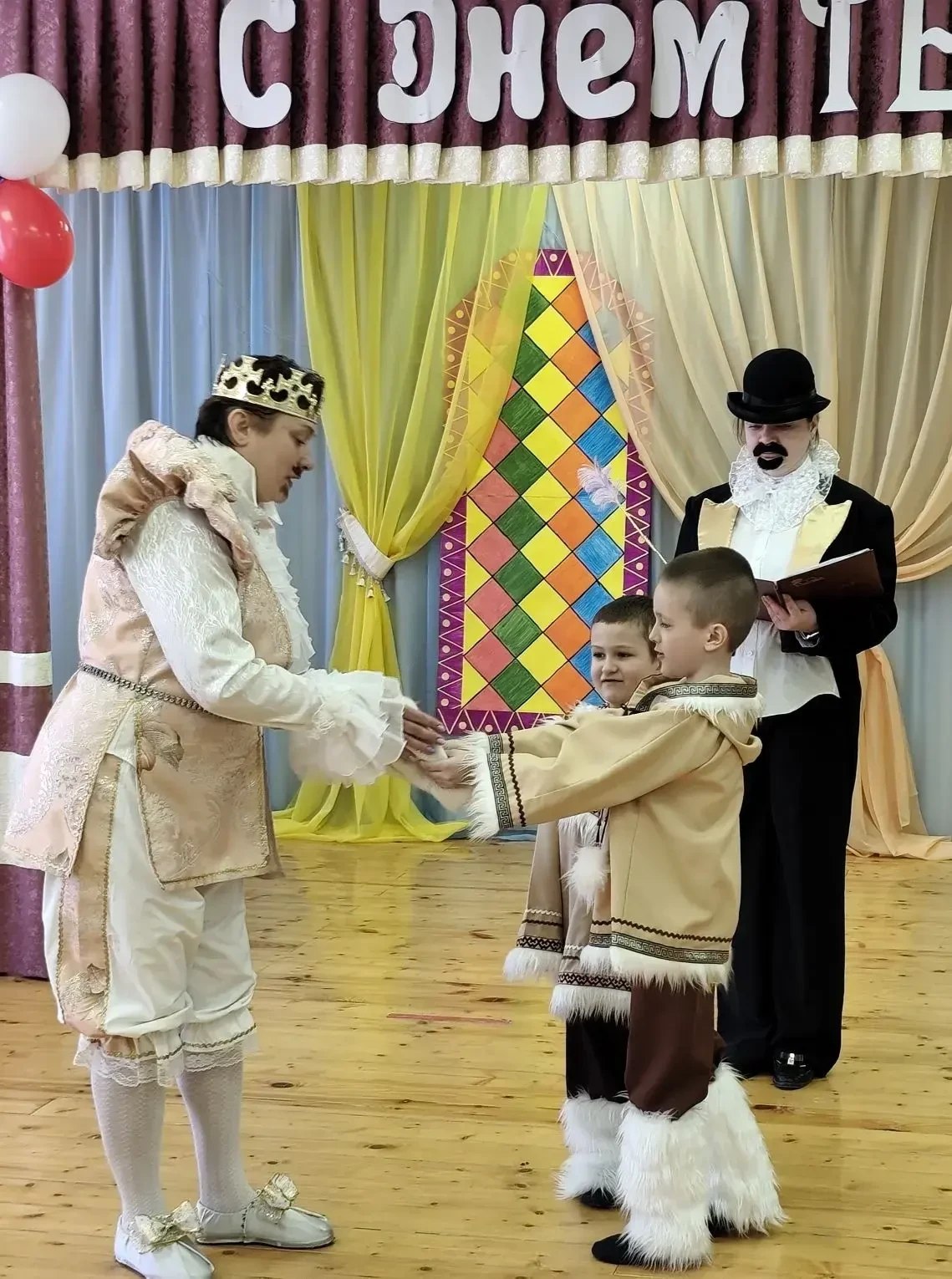 Музыкальный зал на время превратился в «Солнечное царство». Дети в образе сказочных героев разыграли историю, полную волшебных превращений, неожиданных приключений и борьбы добра со злом. Яркие костюмы, декорации и эмоциональная игра актёров создали по-настоящему праздничную атмосферу.