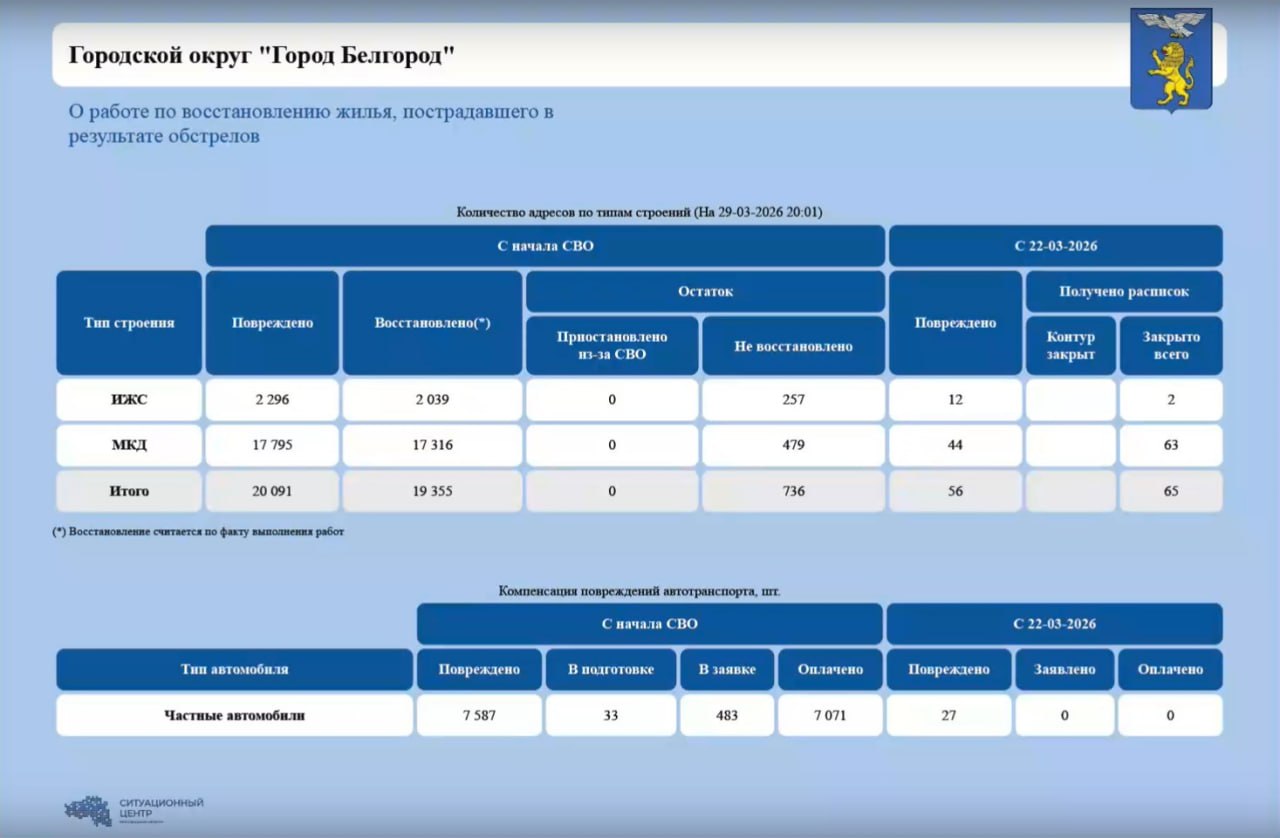 За прошедшую неделю в Белгороде повреждены 27 автомобилей. В работе остаётся 33 машины. В планах выплатить компенсации до 5 апреля.