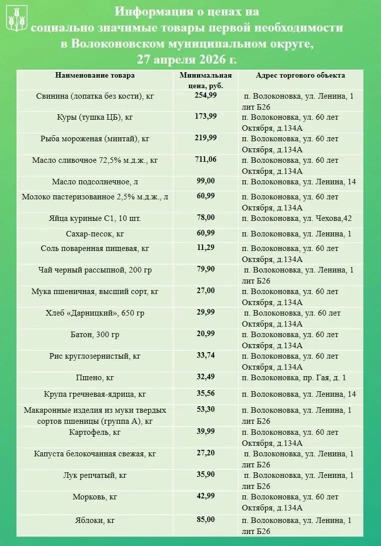 Уважаемые волоконовцы!. Информируем вас о ценах на продовольственные товары из базовой потребительской корзины, складывающихся в нашем муниципалитете на сегодняшний день