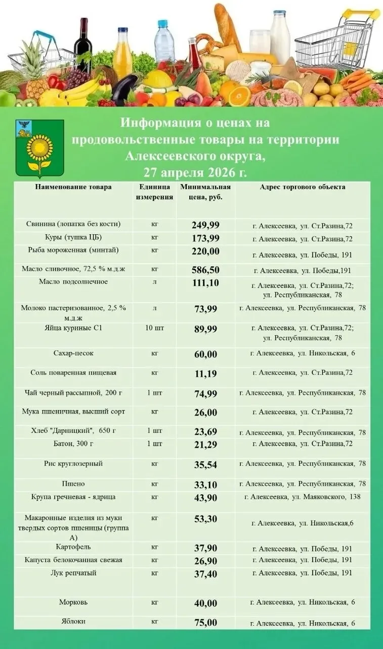 Представляем вашему вниманию обновлённый перечень минимальных цен на продовольственные товары в городе Алексеевка.