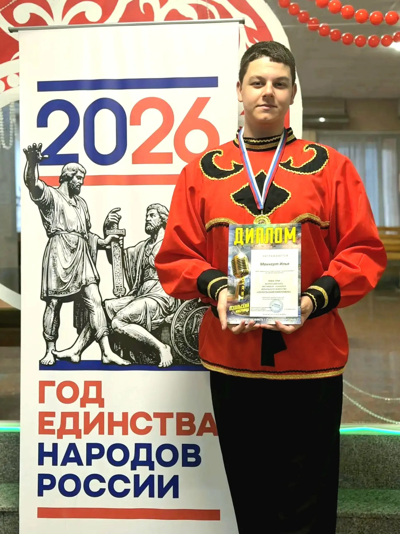 Наш талантливый земляк Илья Маккерт стал лучшим в номинации «Народный вокал. Соло» (возрастная категория 18–25 лет) и заслуженно получил Гран-при конкурса.