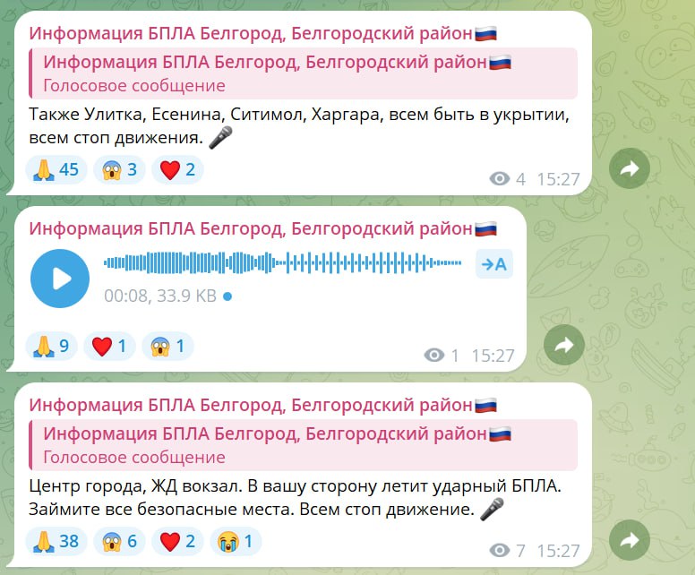 Мониторинговые каналы сообщают об опасности для центра, ж/д, района Ботанического сада и Харгоры.