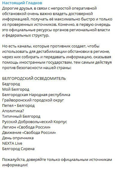 Вячеслав Гладков опубликовал список Telegram-каналов, которые киевский режим использует для дестабилизации обстановки в Белгородской области.