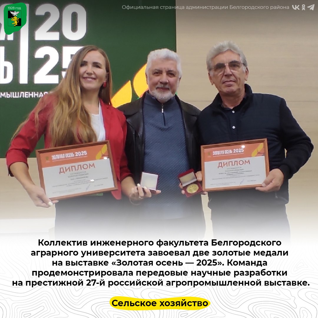 Коллектив инженерного факультета Белгородского аграрного университета завоевал две золотые медали на выставке «Золотая осень — 2025»