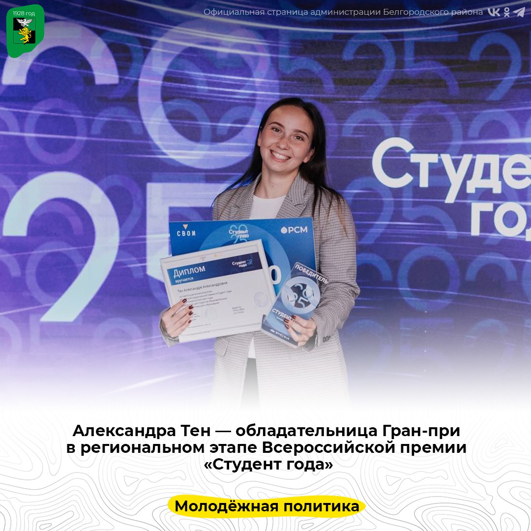 Отметим, что Всероссийская премия «Студент года» — ежегодное событие, призванное выявлять и поддерживать талантливую молодёжь, добившуюся успехов в науке, творчестве, спорте, общественной деятельности и студенческом лидерстве.