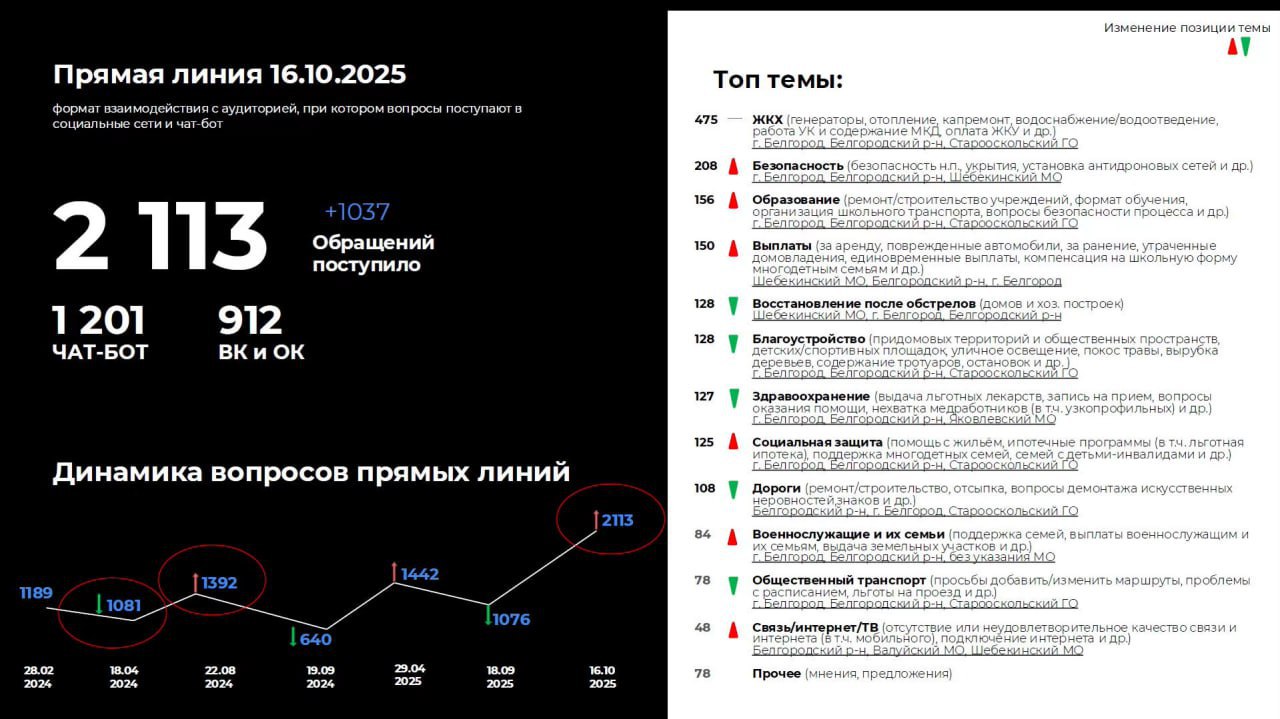 Также отмечен рост вопросов от участников СВО и членов их семей. Вячеслав Гладков поручил разобраться – с чем это связано.