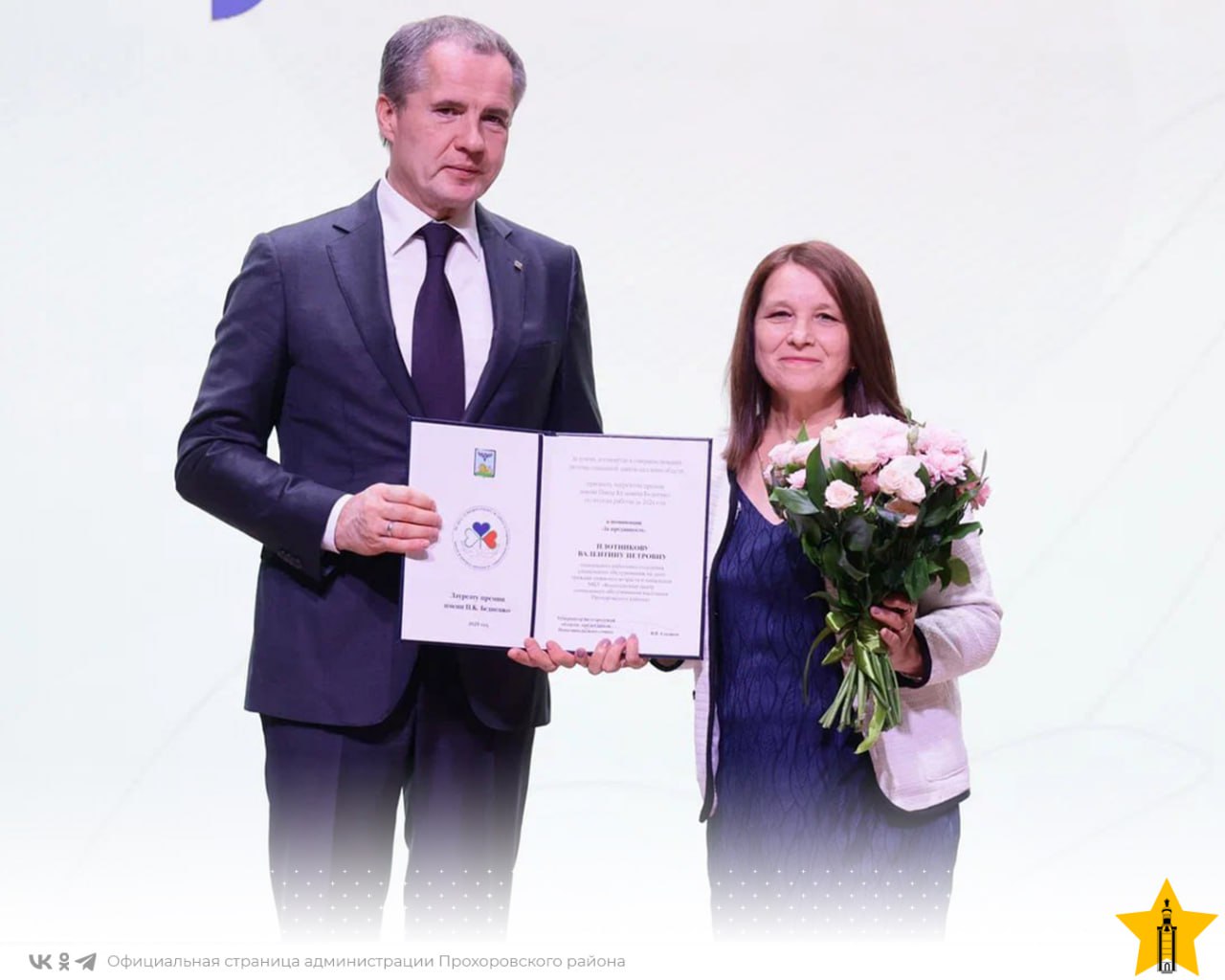 Плотникова Валентина Петровна, сотрудница Комплексного центра социального обслуживания населения Прохоровского района, удостоилась престижной премии имени Павла Кузьмича Бедненко. Награду присуждают за весомый вклад в развитие системы социальной защиты населения Белгородской области.