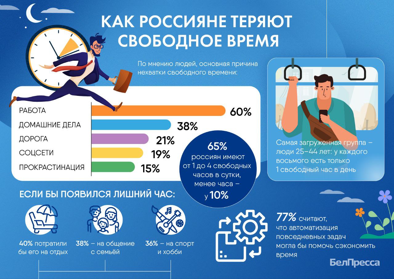 Главная причина дефицита – занятость на работе: 60% опрошенных признаются, что едва находят время на отдых. Чаще всего страдают люди 25–44 лет, у которых в день остаётся всего час для себя.