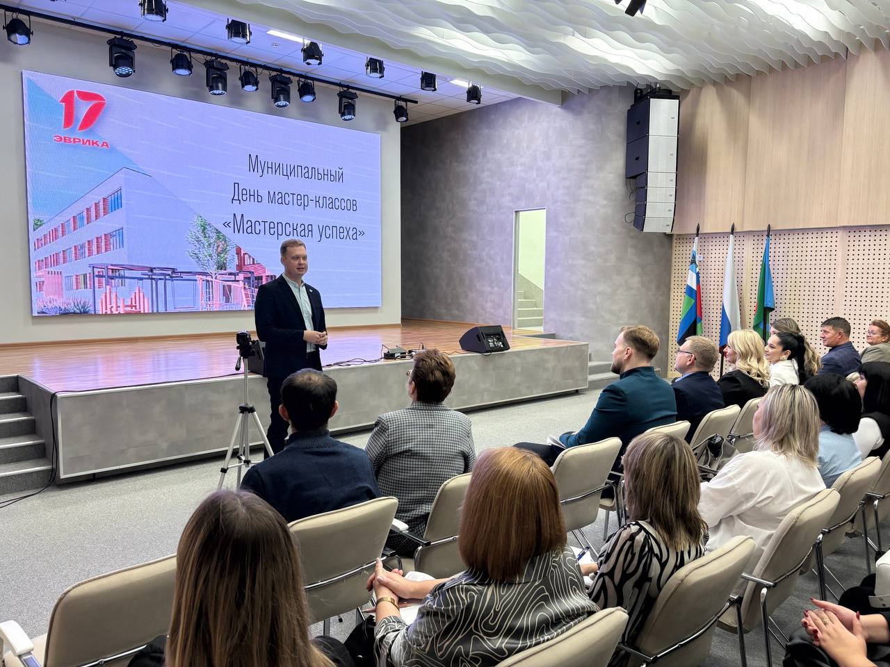 В первый день осенних каникул педагоги городского округа собрались в стенах средней школы №17 на муниципальный день мастер-классов «Мастерская Успеха». С приветственным словом выступил директор учебного заведения Игорь Гребёнкин - призер Всероссийского конкурса «Учитель года России-2024».