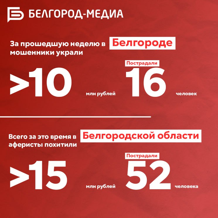 В Белгороде за этот период от действий злоумышленников пострадали 16 человек. Общий ущерб составил более 10 млн рублей.