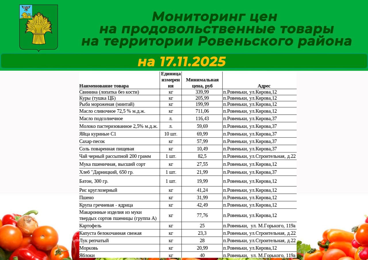 Делюсь с вами подборкой цен на социально значимые продукты на территории Ровеньского района по состоянию на 17 ноября 2025 года.