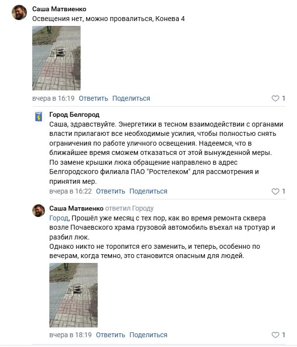 В мэрии ответили, что обращение по поводу люка направили в белгородский филиал «Ростелекома» для принятия мер.