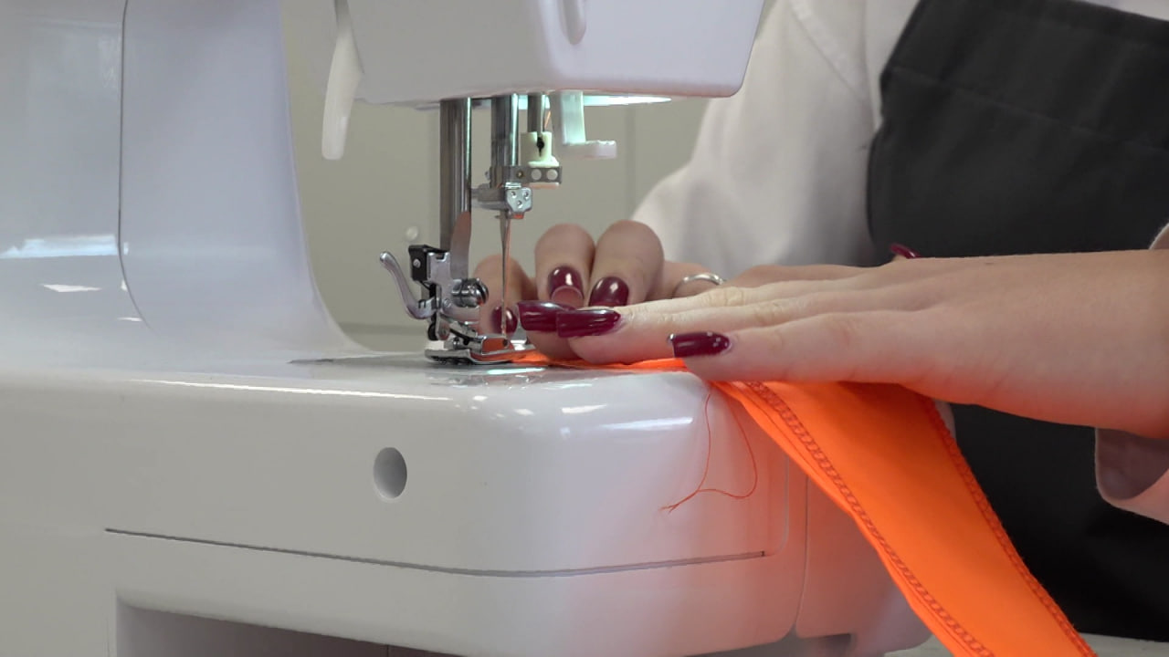 Полина учится в девятом классе. На уроках технологии вместе с одноклассницами теперь шьёт световозвращающие повязки. Сначала вырезают основу из неоновой ткани, затем крепят материал, который как раз видно в темноте, и липучки. Эту ленту будет носить сама.