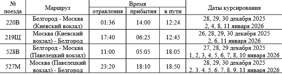На новогодние праздники между Белгородом и Москвой запустят дополнительные поезда