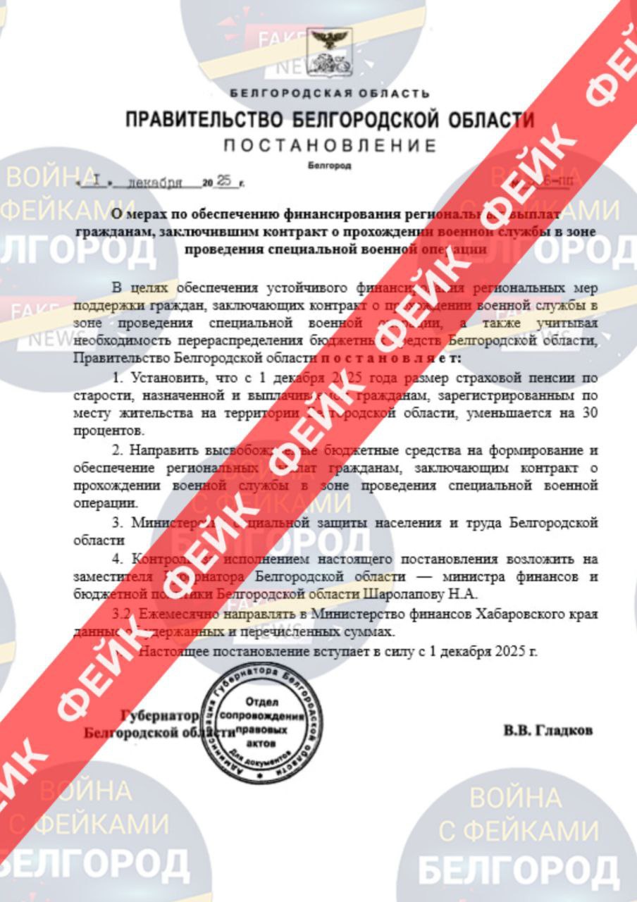 Фейк: в Белгородской области с 1 декабря пенсии уменьшатся на 30%, а деньги будут распределены на региональные выплаты для ветеранов СВО. Скрин постановления регионального правительства раскидывают по предложкам телеграм-каналов.