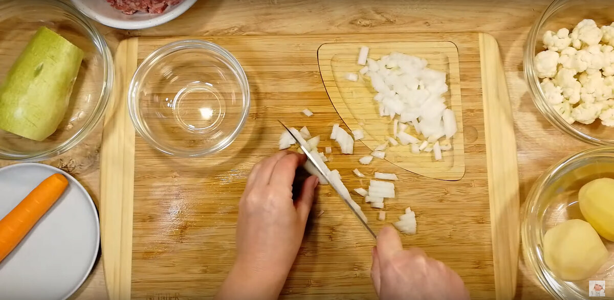 Приготовление этого супа начинается с нарезки ингредиентов. Небольшую луковицу следует измельчить кубиками, а морковь натереть на крупной терке. Картошку и кабачки нарезают мелкими кубиками, а цветную капусту разбивают на соцветия.