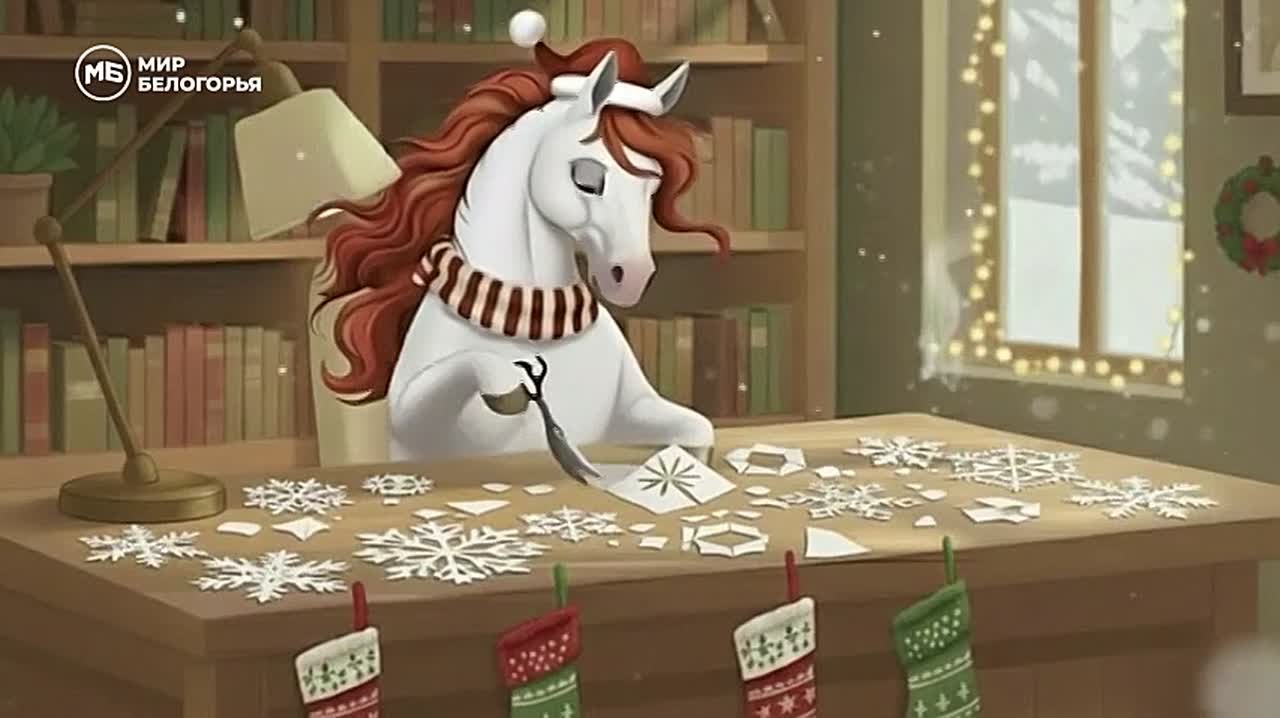 Лошадка усердно вырезает из бумаги ажурные снежинки. Она уверена: если украсить окошки своего уютного домика, то главный волшебник – Дед Мороз – точно не сможет пролететь мимо. Говорят, ярко украшенные окна – его самый верный путеводитель!