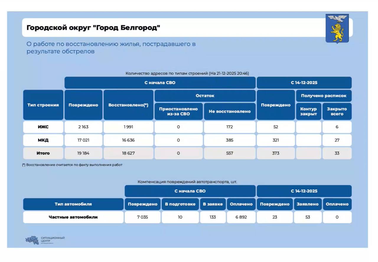 За неделю в Белгороде повреждено 373 жилых объекта и 23 автомобиля