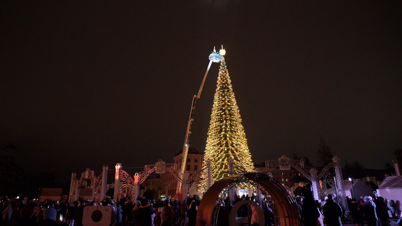 И вот, долгожданный момент. Зимний волшебник поднялся к верхушке главной елки региона и с помощью посоха сотворил чудо.